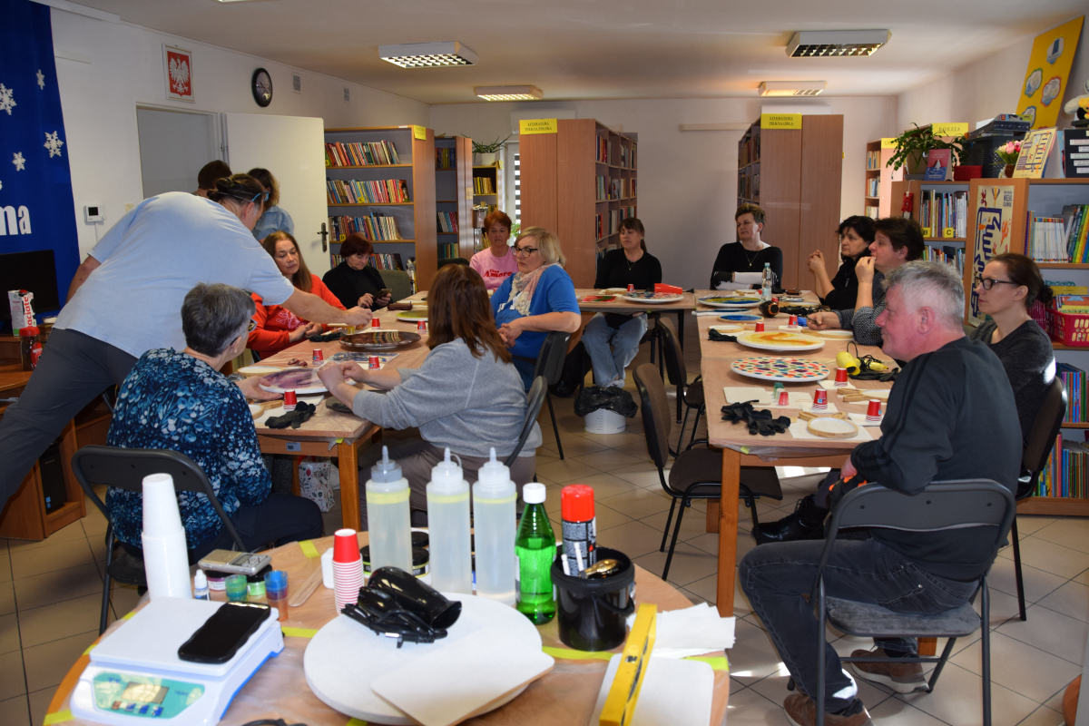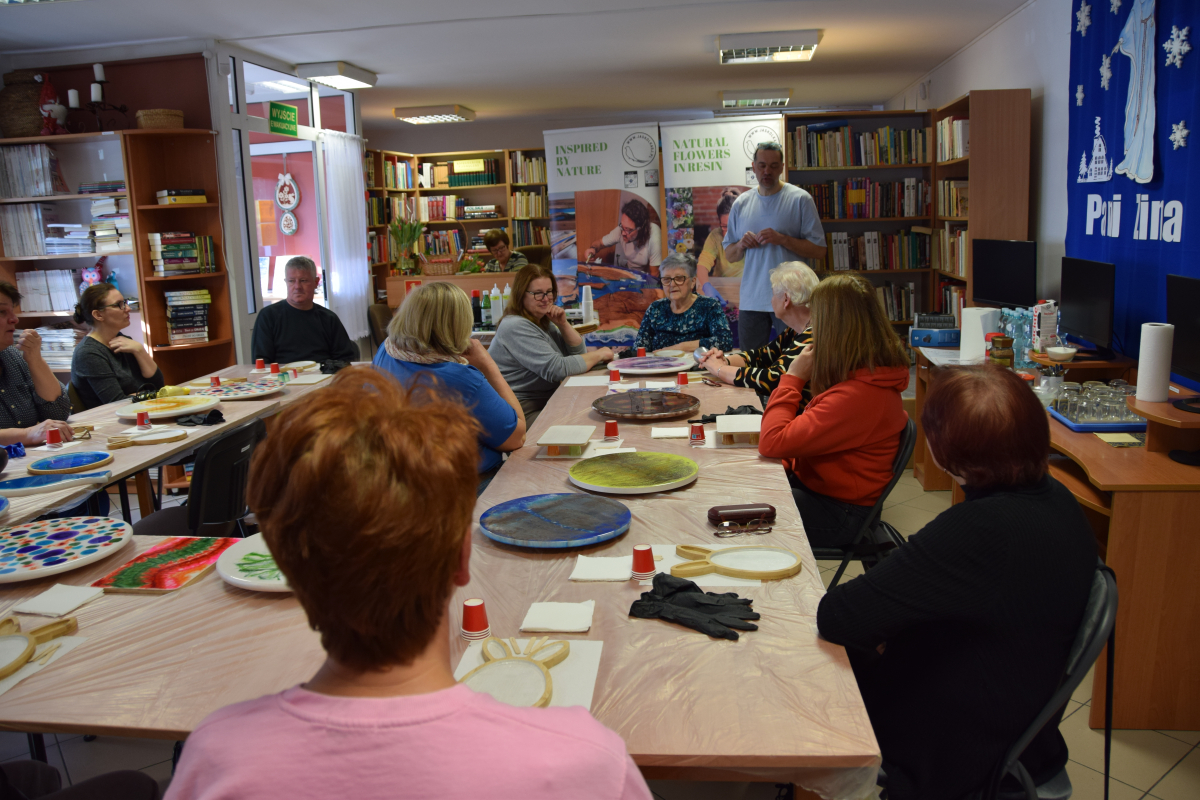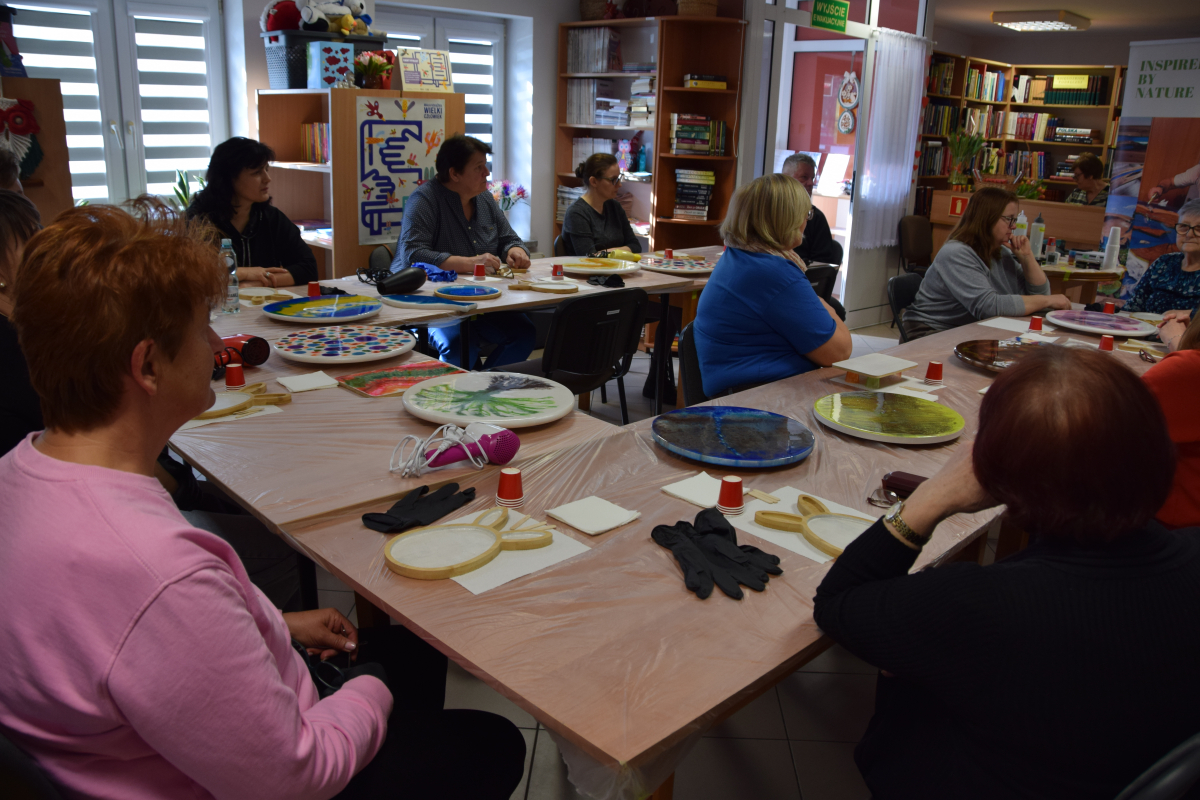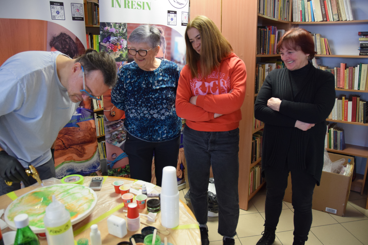 Wspólne warsztaty artystyczne, zorganizowane przez bibliotekę, przyciągnęły miłośników rękodzieła w różnym wieku. Głównym celem spotkania była nauka pracy z żywicą epoksydową, która staje się coraz popularniejsza w tworzeniu autorskiej biżuterii, dekoracji oraz przedmiotów użytkowych.