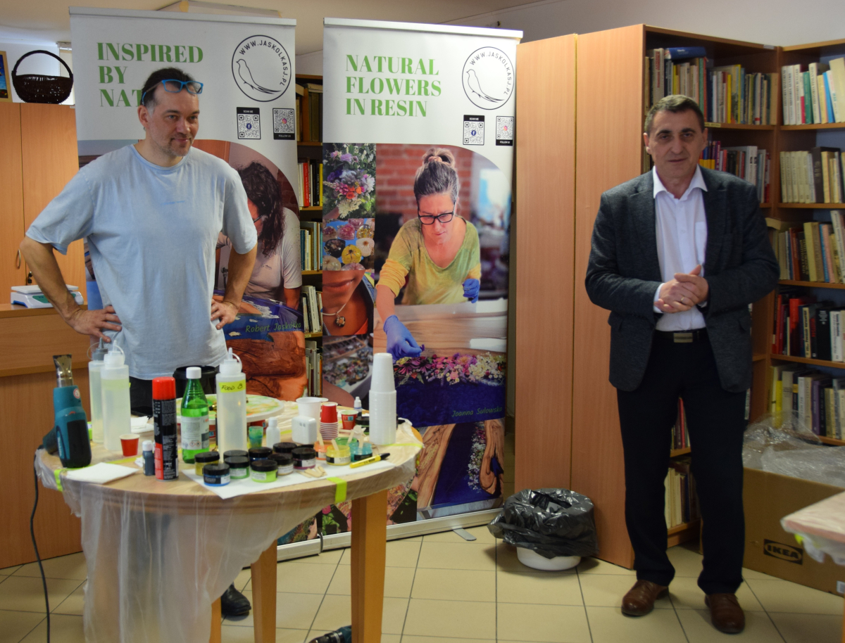 Pan Robert Jaskółka wraz z Joanną Sulowską prowadzi firmę Jaskolkasj, która specjalizuje się w tworzeniu unikalnych mebli i dekoracji łączących drewno z żywicą oraz odnawianiu starych mebli. Od niedawna Pan Robert jest mieszkańcem naszej gminy, gdzie za swój mały świat obrał malowniczą miejscowość Dzierążnia. Dzierążnia to rzeczywiście urokliwe miejsce, które swoimi walorami przyrodniczymi i spokojem przyciąga osoby szukające wytchnienia "pod lasem". Nowi mieszkańcy często wnoszą do gminy świeżą energię i ciekawe perspektywy, także tym razem swoją energię Pan Rober przeniósł do naszej placówki bibliotecznej w Krynicach.