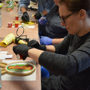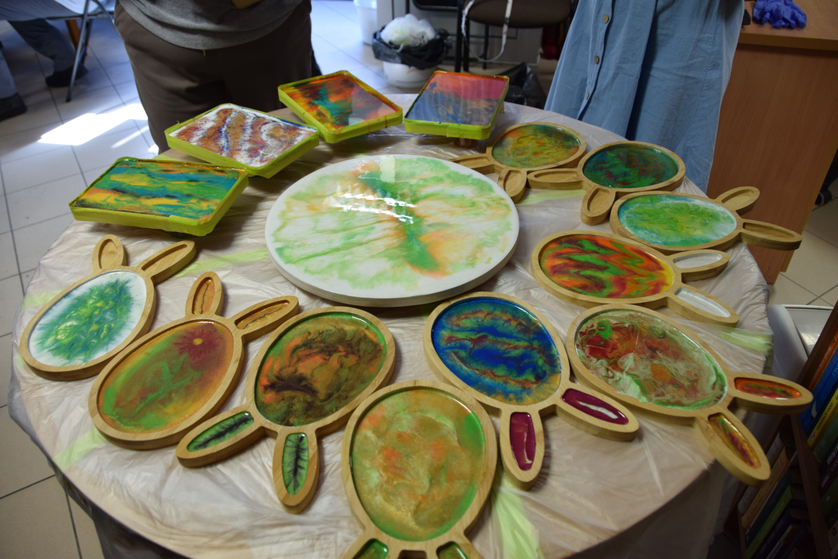 Podczas kilkugodzinnych zajęć uczestnicy uczyli się podstaw bezpieczeństwa pracy z żywicą, odpowiedniego mieszania składników oraz barwienia. Najwięcej emocji wzbudził etap tworzenia podstawek wypełnionych krystaliczną żywicą.